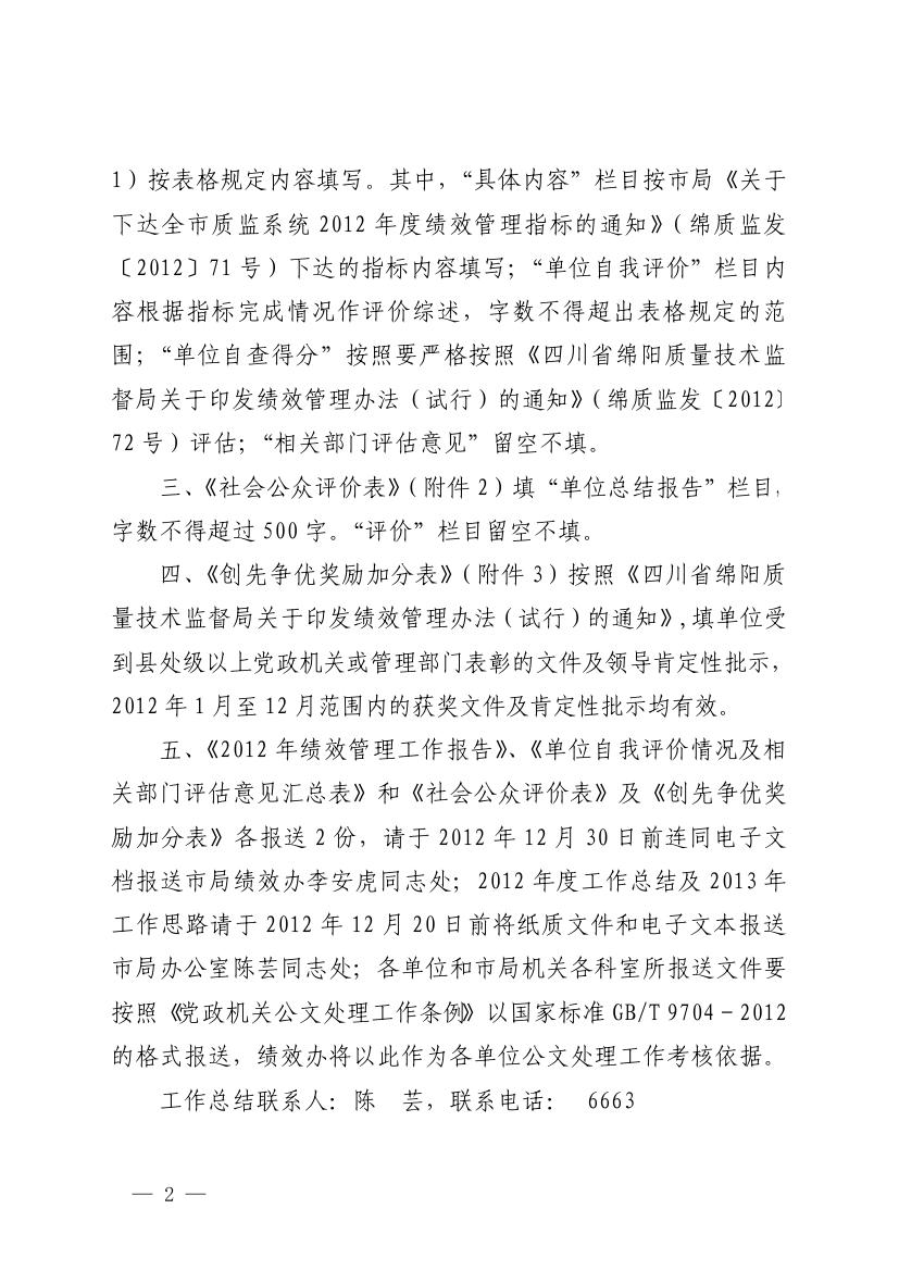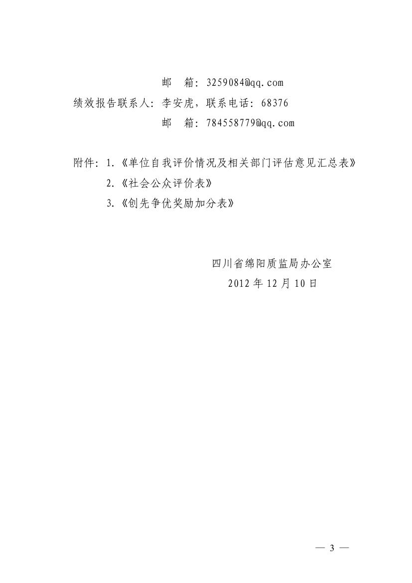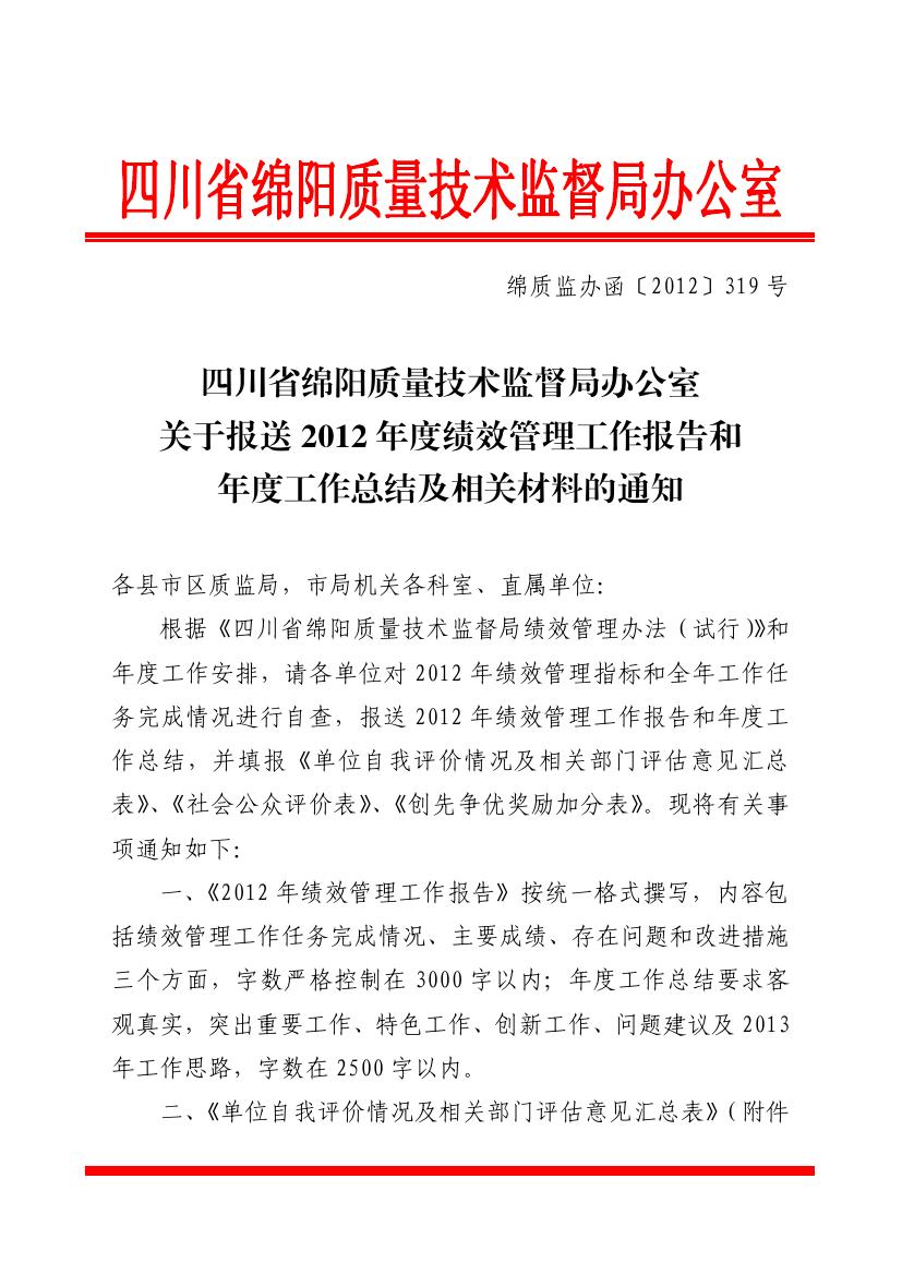 四川省绵阳质量技术监督局办公室关于报送2012年度绩效管理工作报告和年度工作总结及相关材料的通知
